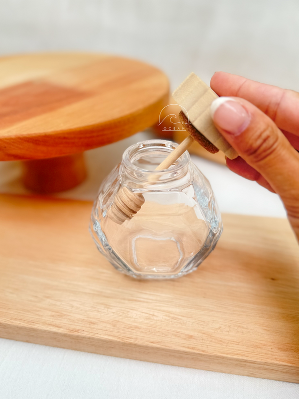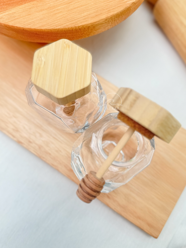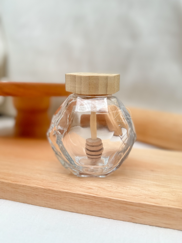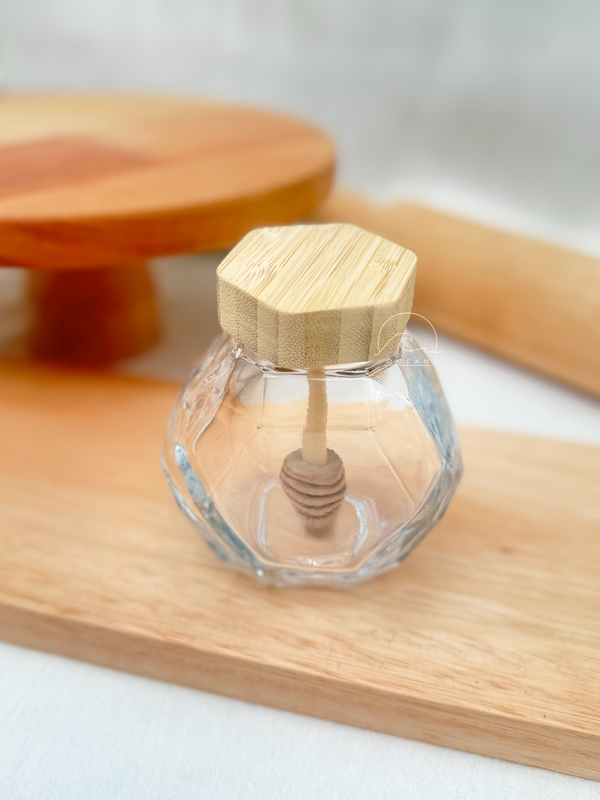 Frasco de vidrio con tapa de bambú y palito mielero.