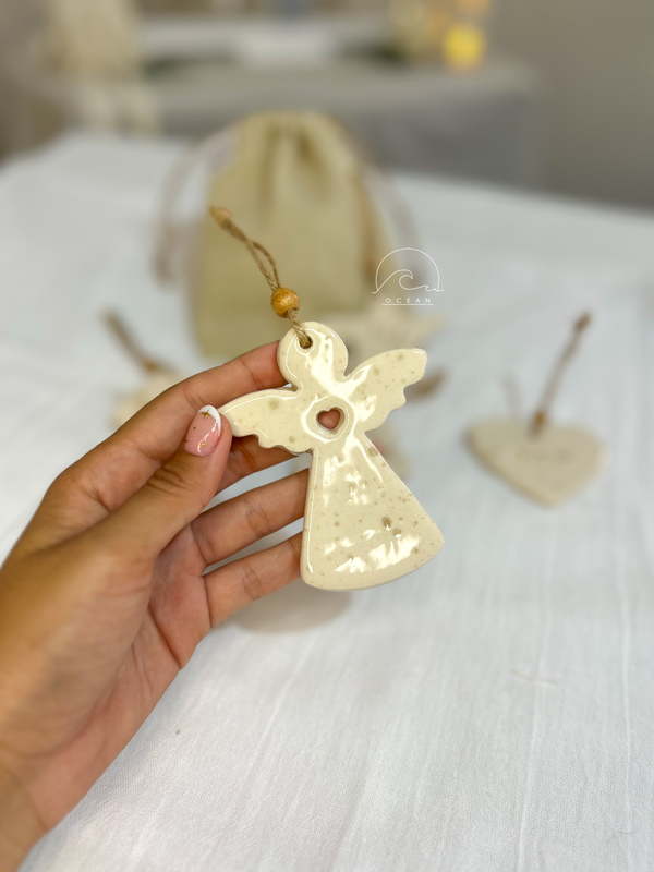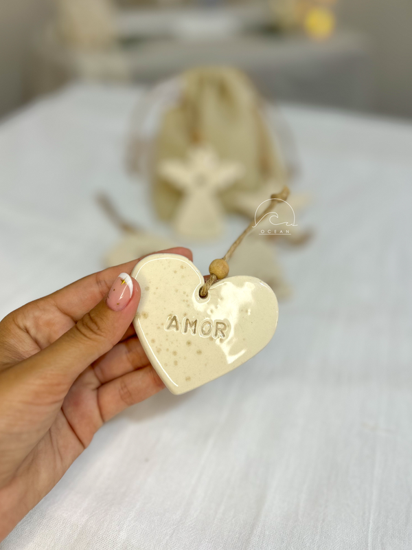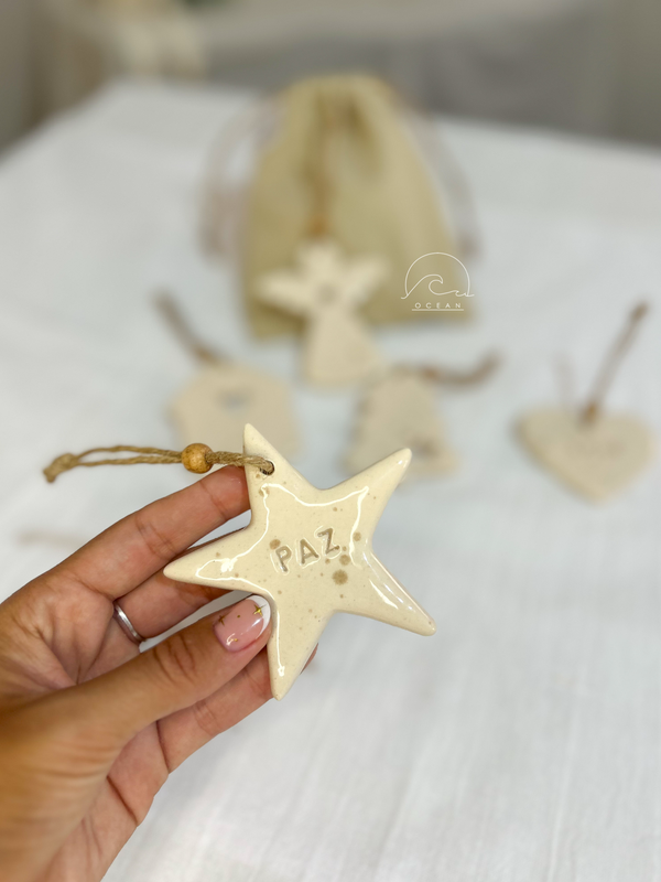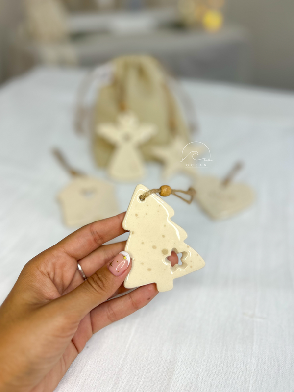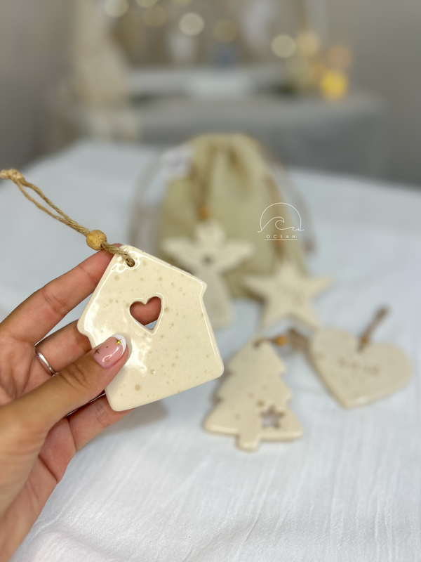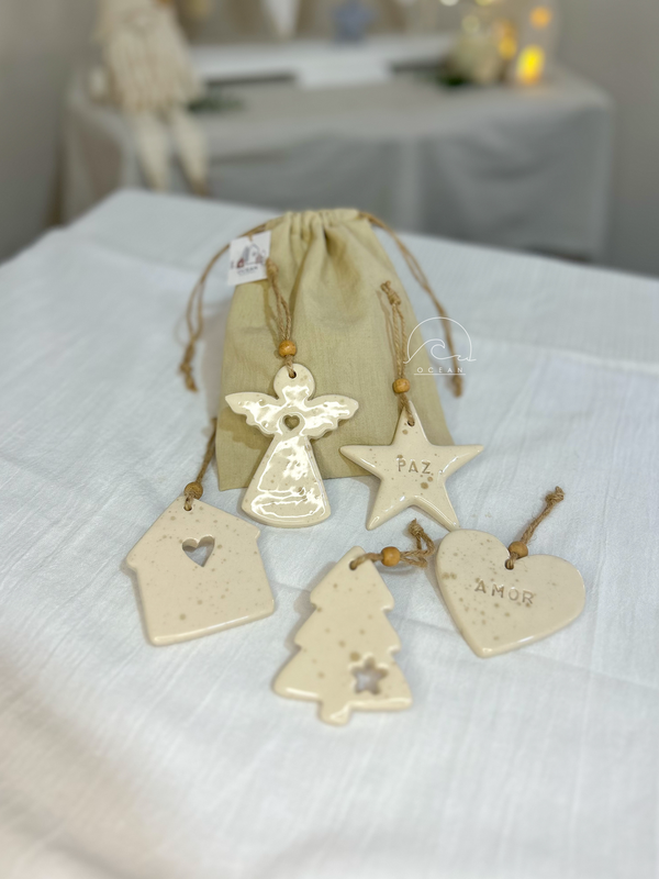 Figuras de cerámica, con hilo de yute para colgar.